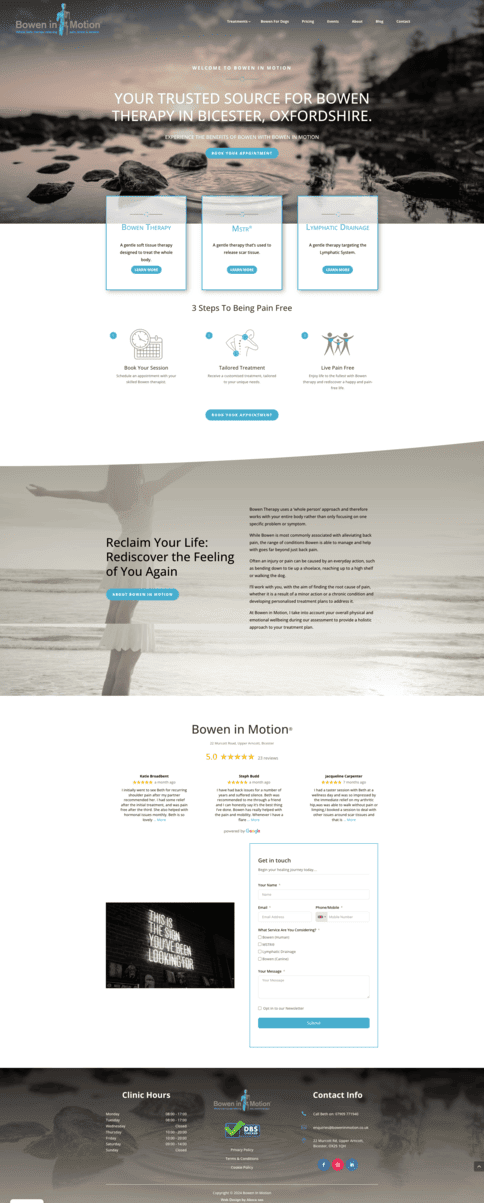 Beth’s feedback, coupled with the positive responses from her clients, underscores the impact of the new website. It’s more than just a platform; it’s a digital extension of her practice’s commitment to well-being and personalised care. The site now effectively communicates the essence of Bowen in Motion, inviting visitors to explore and understand the healing potential Beth offers.